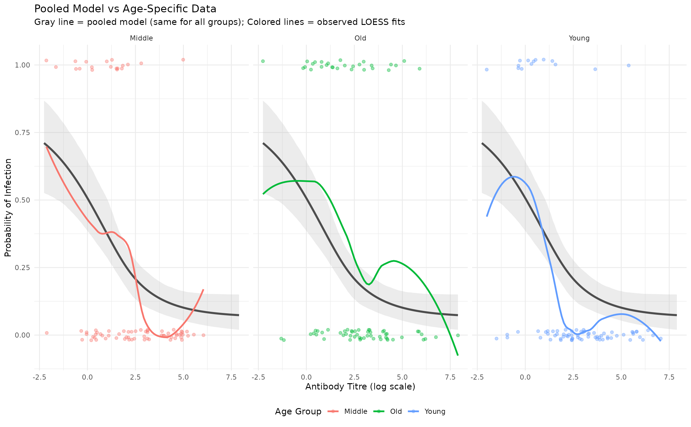 Note how: - The pooled model (gray line) uses the same curve for all age groups, ignoring heterogeneity - The observed patterns (colored LOESS curves) show clear age-specific differences - The hierarchical model (shown in the previous plot) captures these group-specific relationships - The pooled approach misses important variation, particularly the flat relationship in older adults