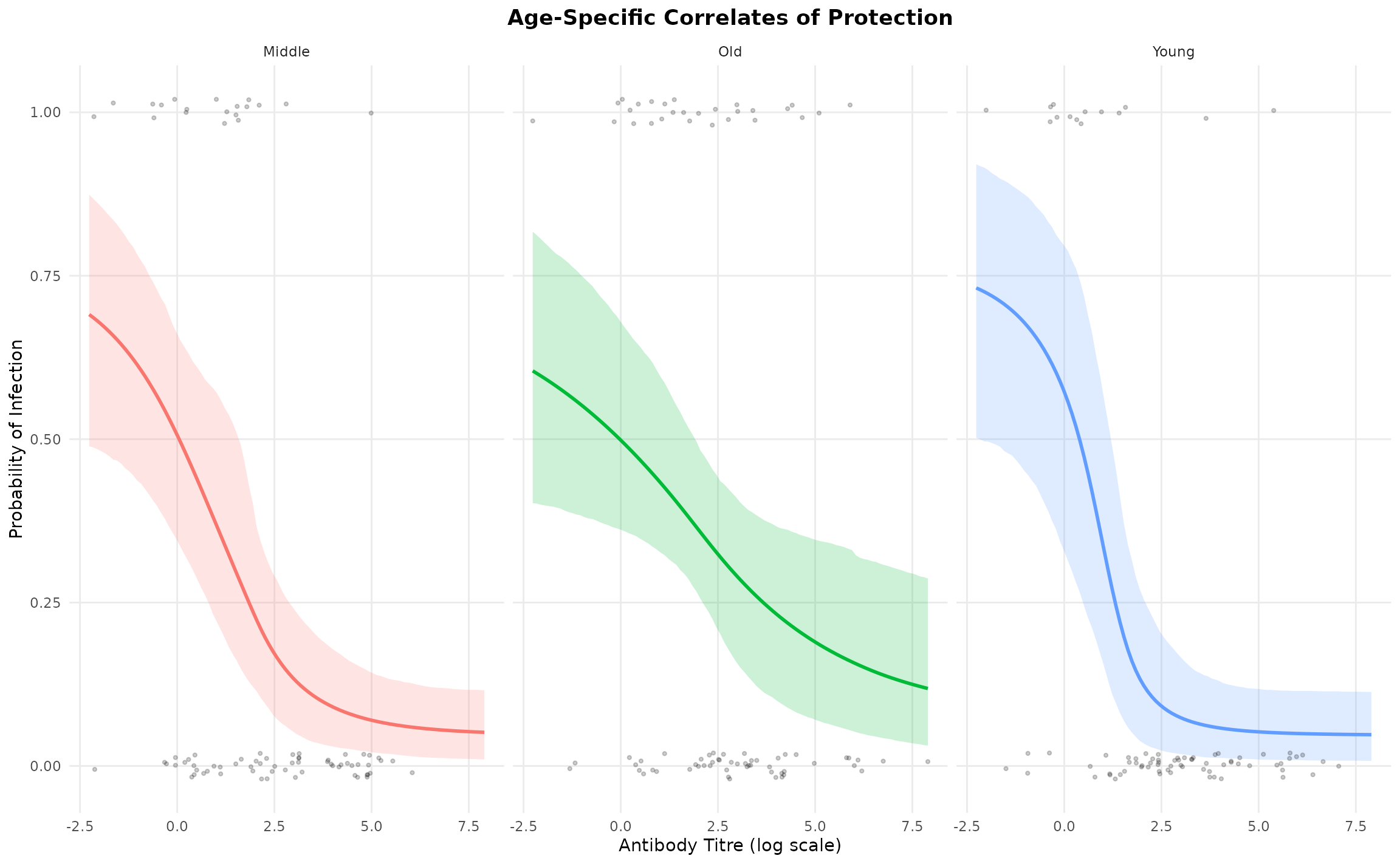 We’ll demonstrate with a realistic scenario where antibody titre is a correlate of protection, but the strength of this relationship varies by age group: