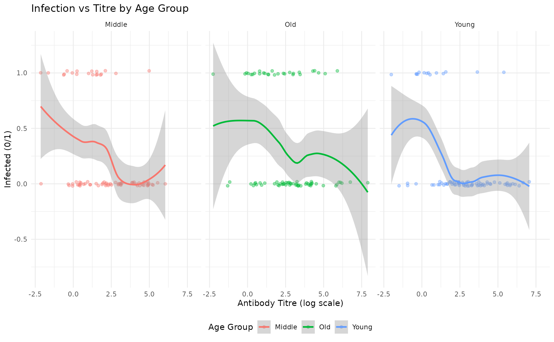 ggplot(all_data, aes(x = titre, y = infected, color = age_group)) +