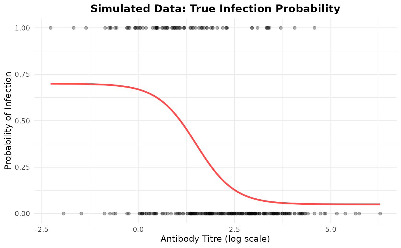 We’ll simulate data where the probability of infection follows a four-parameter logistic curve as a function of antibody titre. The parameters we’ll use are:
